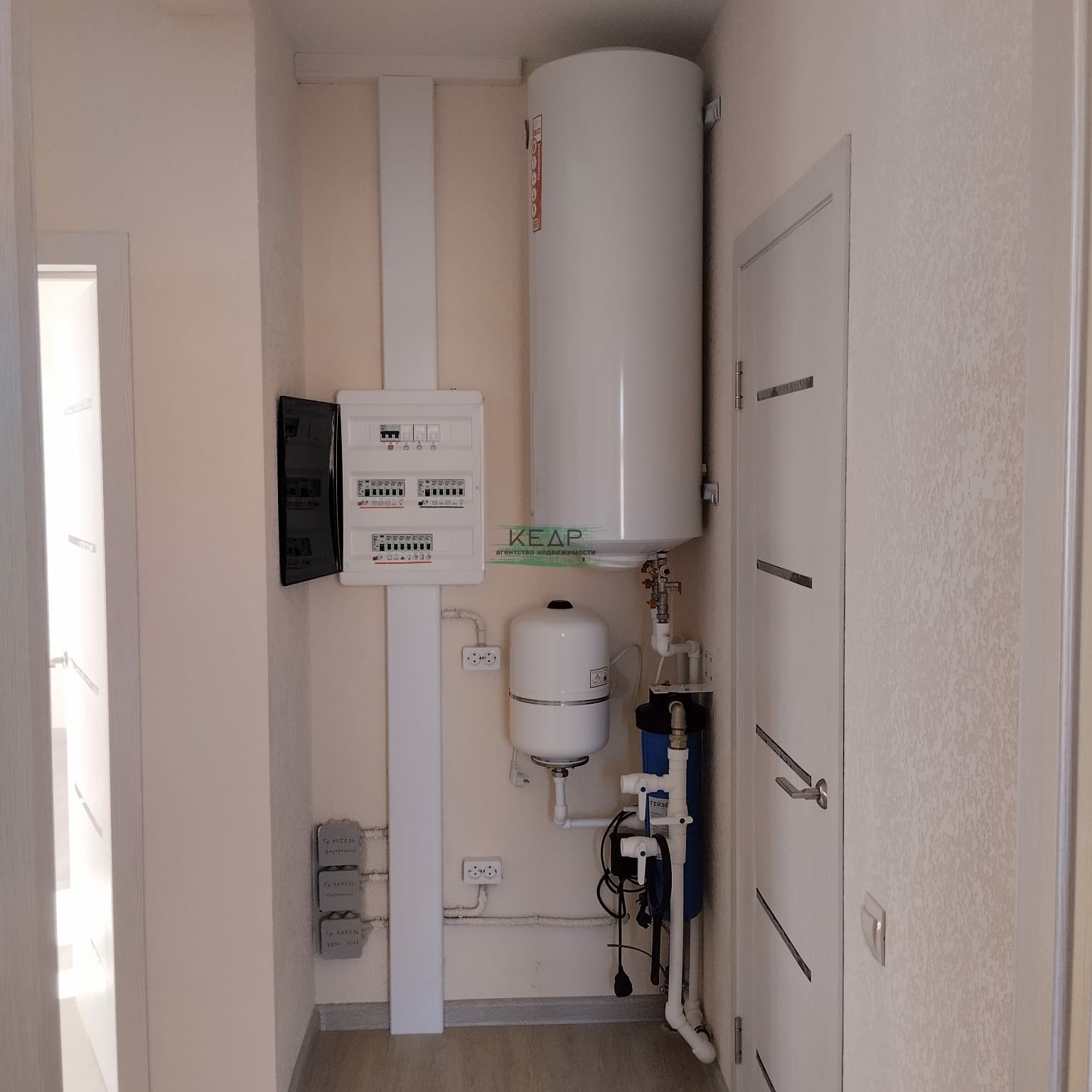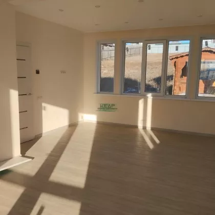 Внутренняя отделка -на стенах гипсокартон с покраской , на полу кварц винил замковой, натяжной потолок, в санузле - по полу керамогранит, по стенам ПВХ плитка.