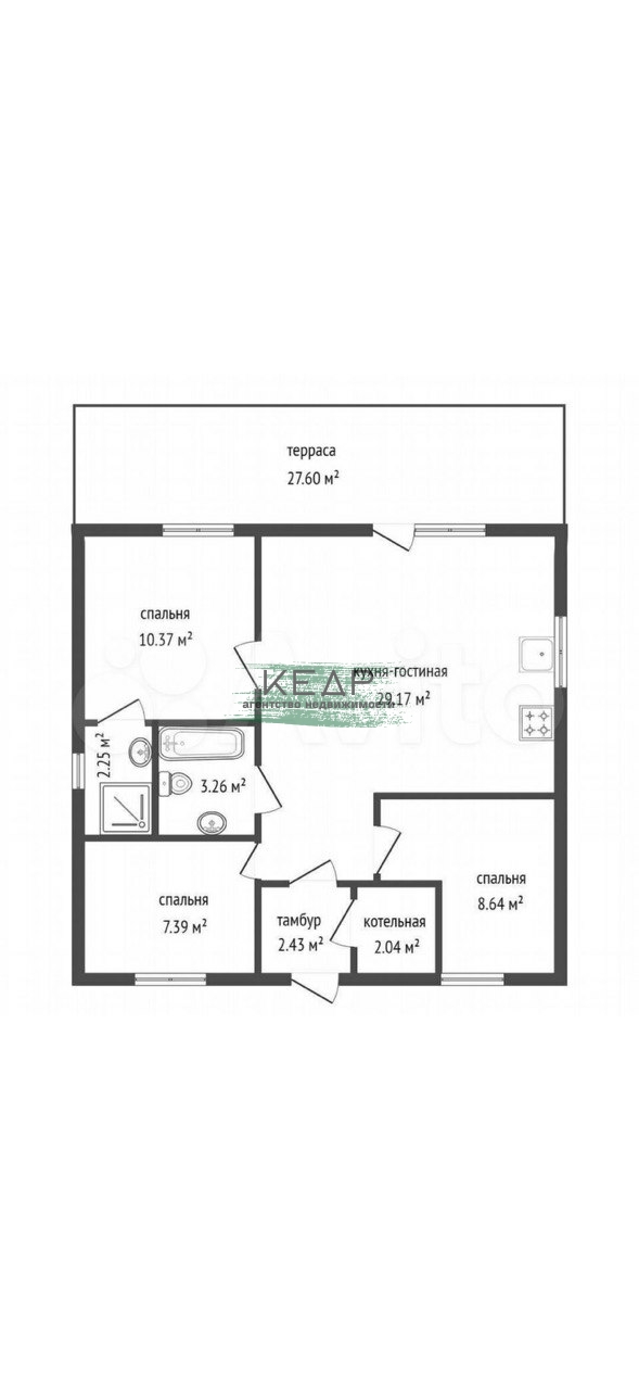 Тpи спaльни (10,37 м2 , 8,64 м2, 7,39 м2), свeтлaя кухня - гocтиная (29,17 м2) с пaноpамными oкнaми и выxoдом нa освещeнную тeррасу (30 кв.м). Два санузла - 3,26 м2 и 2,25 м2. В доме предусмотрены места для расположения стенных шкафов, что значительно улучшает качество жизни, позволяя сохранять свободное пространство. Для сохранения тишины, котельное и насосное оборудование вынесено в отдельное техническое помещение (2,04 м2). Дополнительный мансардный этаж позволяет распланировать помещения по своему усмотрению.