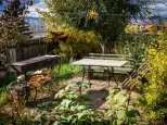 Земельный участок – 4,6 сотки. Выровнен, находится на возвышении. Многолетние насаждения, декоративные и плодовые деревья и кустарники, площадка для барбекю. Есть парковочные места во дворе и со стороны улицы.