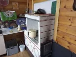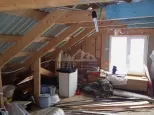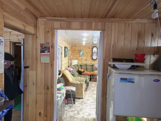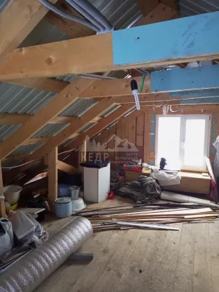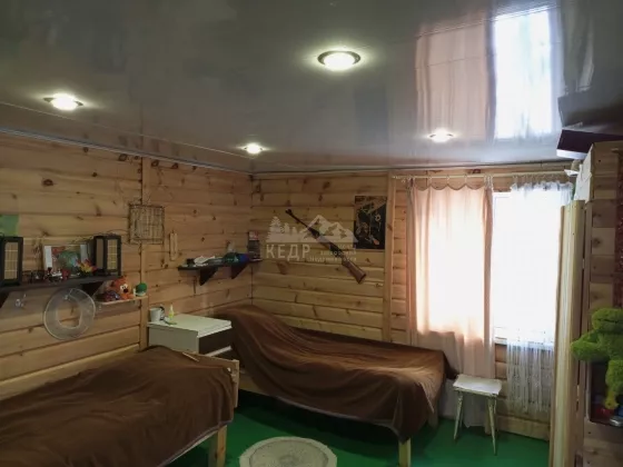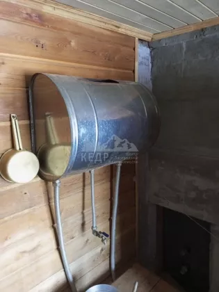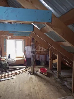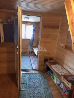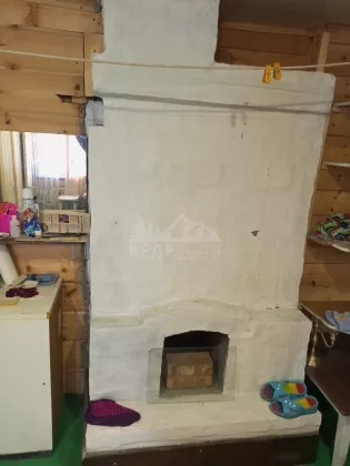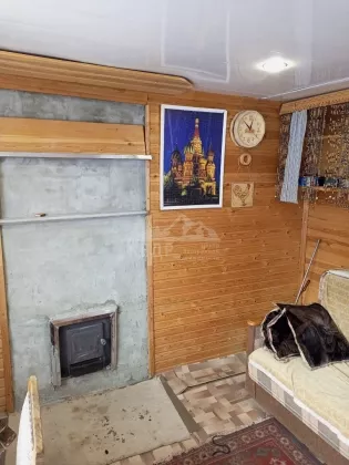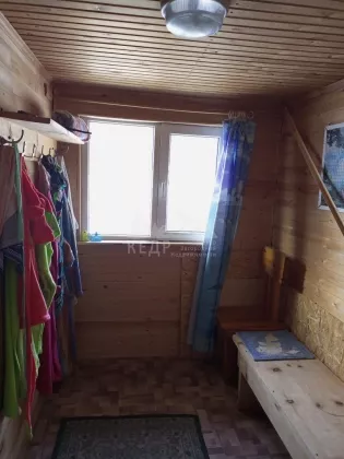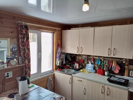 На участке 13 соток расположен дом из бруса 79,8 кв.м. (обшит сайдингом), В доме: 1-й этаж: прихожая, 2 просторные комнаты, кухня. Внутри стены обшиты кедром (имитация бруса). Потолки отделаны панелями ПВХ.