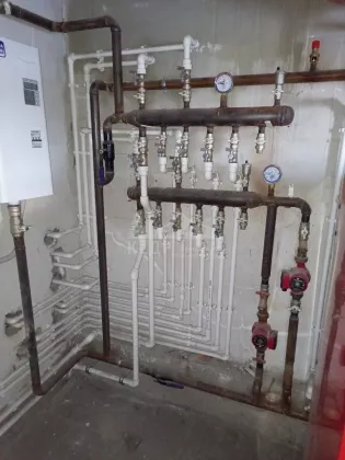 Отопление: твердотоплевный котел (автомат) + электрокотел. 1-й этаж теплый пол+радиаторы, 2-й этаж радиаторы.