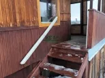 Двухэтажный дом с цоколем из бруса, на сваях, с новыми окнами и металлической дверью.