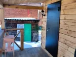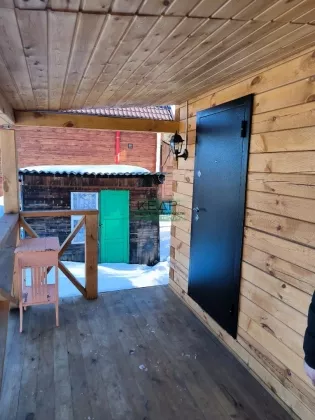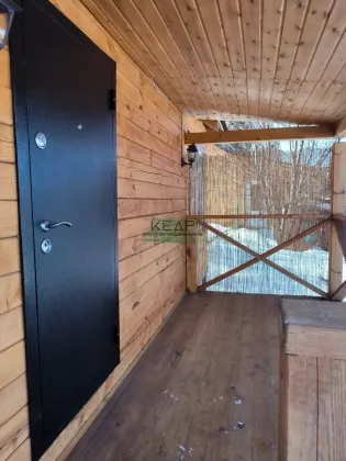 Стены - брус 150х150 мм, проконопачен, покрыт лаком. Входная дверь металлическая. Перед входом в дом просторная терраса.