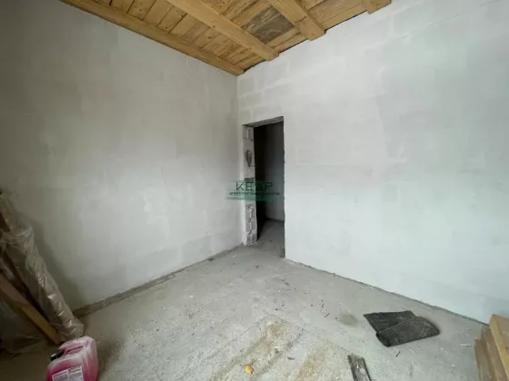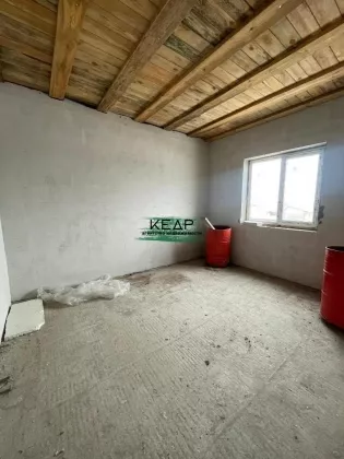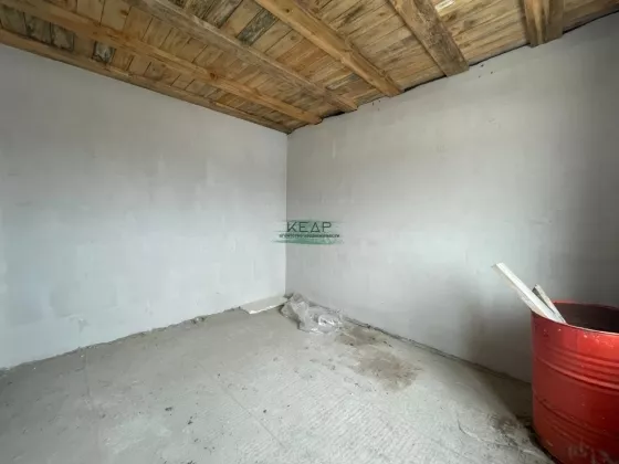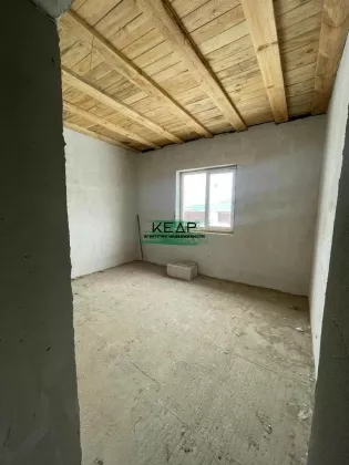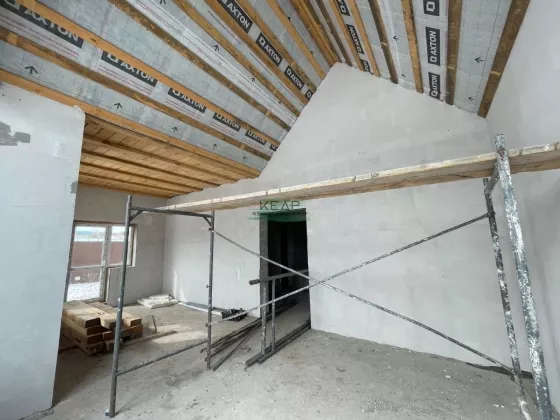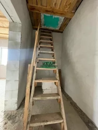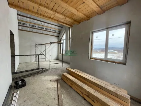 Дом расположен на надежном свайно – ростверковом фундаменте с ж/б плитой, Т=200мм,утепленной теплоизоляцией «термит» Т=100мм, построен из Байкальского газобетона Б4-400, 400х250х625. Фасад облицован качественной декоративной штукатуркой, кровля - металлочерепица, цвет темно- коричневый (RR 32) по стропильной системе с чердачным перекрытием, утепленным каменной ватой Т=150мм. Потолок в кухне-гостиной - 2й свет.
