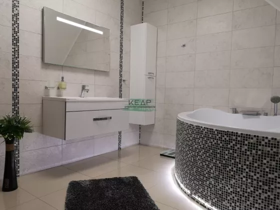Электричество 15кВт. Центральное холодное водоснабжение. Отопление газовое. Теплые полы по всему первому этажу, частично на втором.