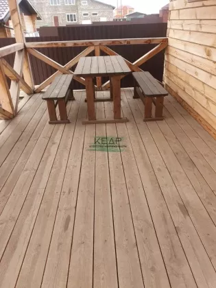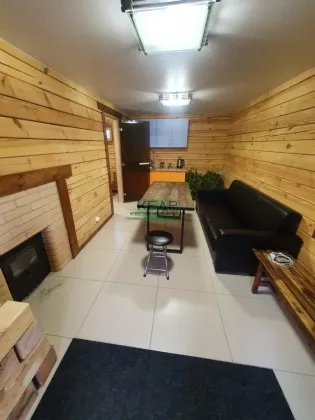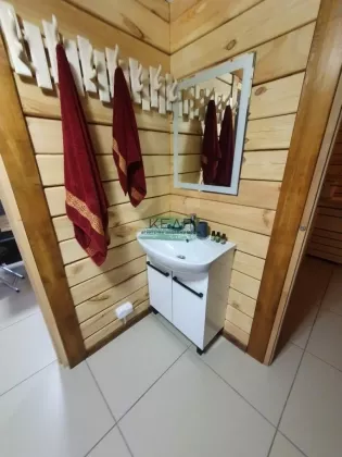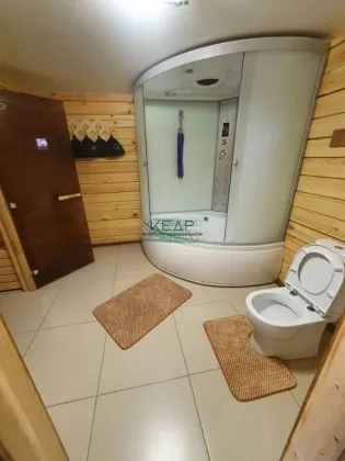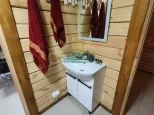 Баня (6х9) построена из бруса на 12-ти сваях. Состоит из трех помещений: комната отдыха (с теплыми полами), помывочная (с душевой кабиной, раковиной, унитазом), парилка. Терраса 6*1,7.