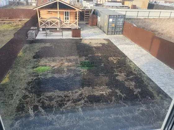 Участок правильной формы, ровный. Земля разработана под посадки. Придомовая территория, дорожки по участку выложены брусчаткой.