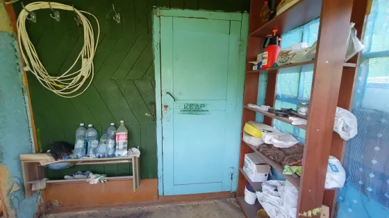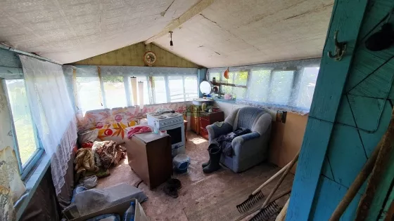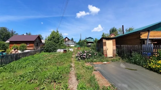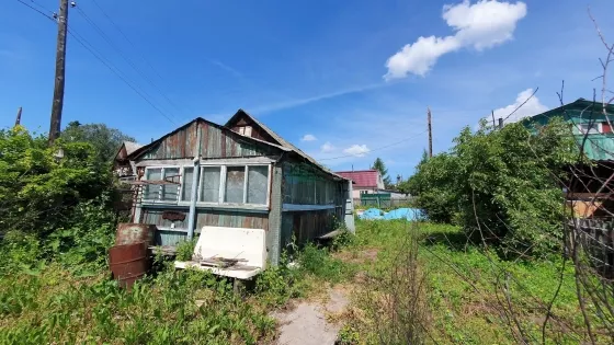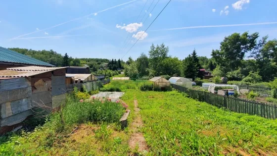 Участок вытянутой формы, с небольшим уклоном, огорожен деревянным забором. Стоит две теплицы, баня, которая требует ремонта, но париться можно и сейчас.