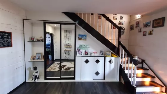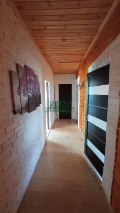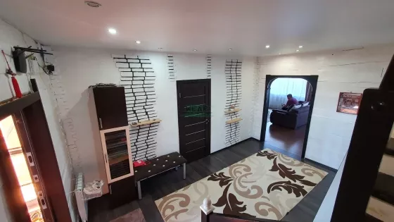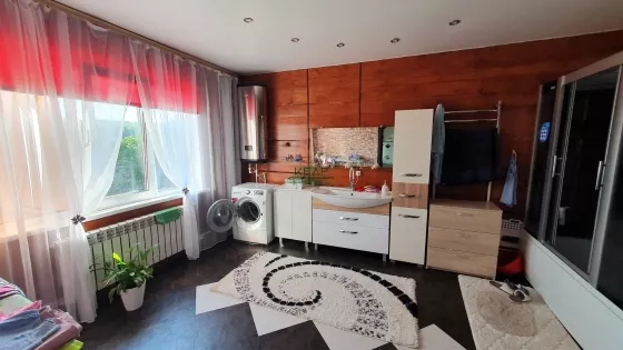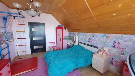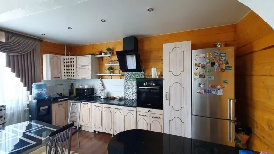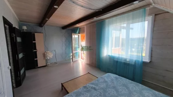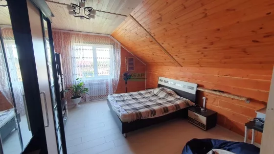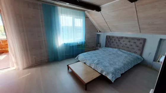 Дом построен из бруса, на ленточном фунаменте, утеплен. На первом этаже расположены кухня-гостиная (40м2), просторная ванная комната (18м2), прихожая с гардеробной (14 м2), утепленная веранда (10 м2) с выходом в теплый гараж. Из гостиной есть выход на террасу (в данный момент достраивается). На втором этаже 3 спальни по 18 м2, одна из них с внушительным балконом (10 м2), сан.узел (2 м2).
