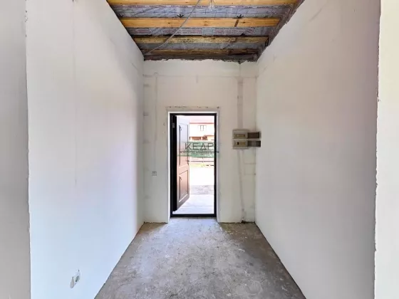 Коридор со входом в свободный зал, в зале окно и стеклянная группа с выходом на участок.
