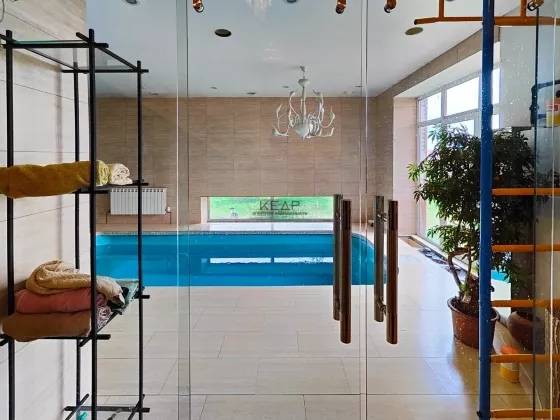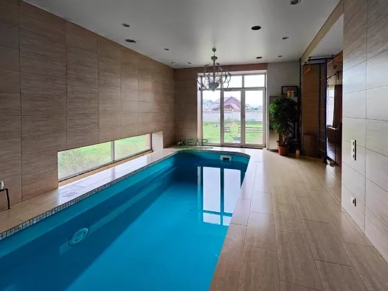 Дом двух этажный с цоколем, гаражом с автоматическими воротами, на два автомобиля и бассейном в доме.