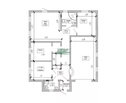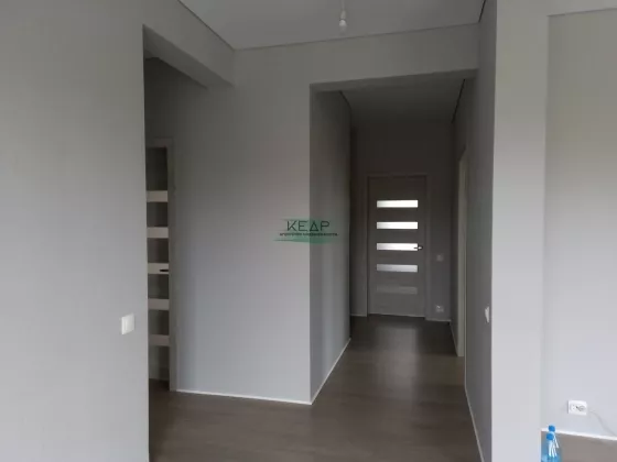 Три спальни (10,3 м2, 10,2 м2 13,6м2), просторная, светлая кухня - гостиная (23м2) с французскими окнами. В доме имеется ванная комната (5,3 м2) и душевая комната (3,5 м2). Предусмотрены места для расположения стенных шкафов и гардеробная, что значительно улучшает качество жизни, позволяя сохранять свободное пространство. Котельное и насосное оборудование вынесено в отдельное техническое помещение расположенное отдельно от жилого пространства.