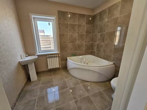 Чистовая внутренняя отделка выполнена в мягких пастельных тонах. Напольное покрытие – ламинат, потолки - натяжные. Санузел отделан керамогранитом, установлена ванна