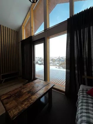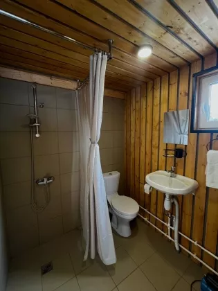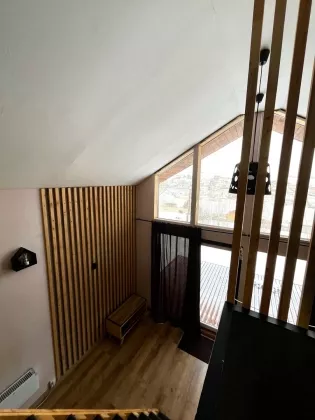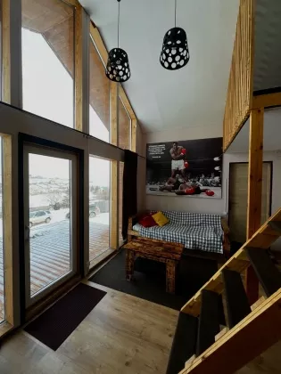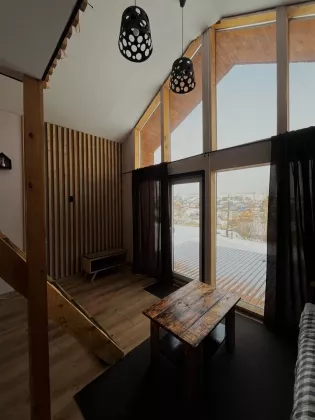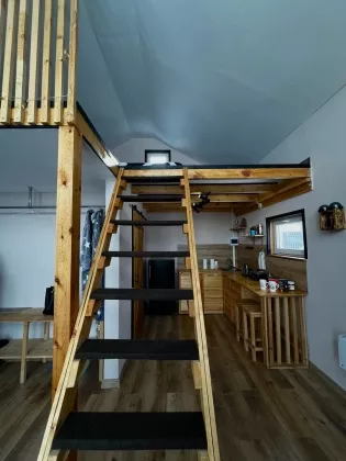 Комфортная планировка: На первом этаже расположена небольшая кухня-гостиная с прекрасными панорамным видом и так же совмещённый санузел. На второй этаж ведёт лестница, где располагается спальное место, откуда так же открывается вид на участок.