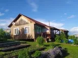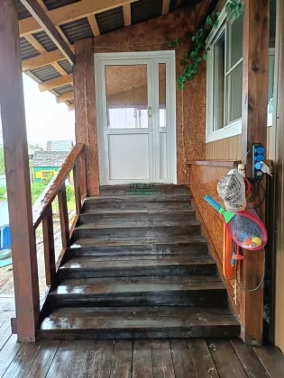 Дом построен из сип-панелей на винтовых сваях 3 метра. Кухня и кочегарка из бруса-утепление минвата. Весь дом обшит проф листом под дерево. Крыша ондулин.