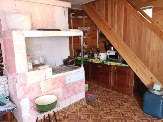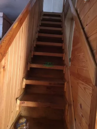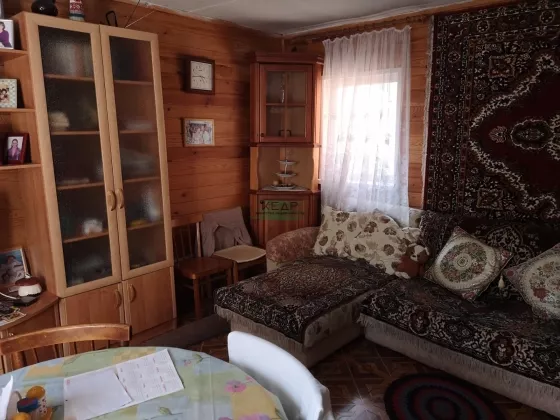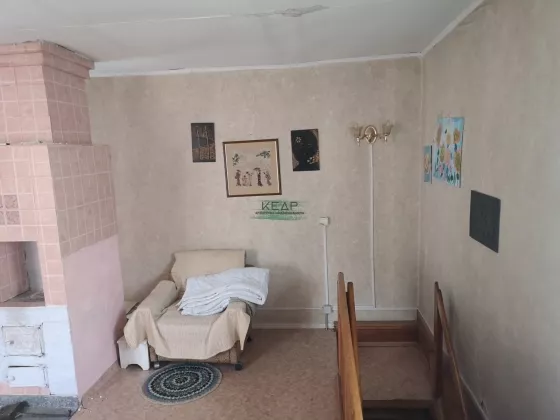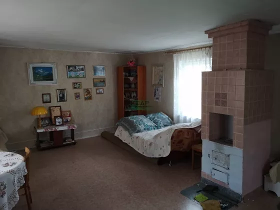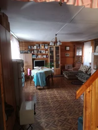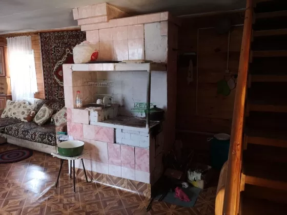 Внутренняя отделка: первый этаж обшит деревом, на полу линолеум, на втором этаже обои, входная металлическая дверь, окна ПВХ, лестница деревянная, печь кирпичная, обложена кафелем.
