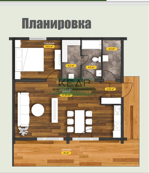 Компактное решение с просторной спальней (10,5 м²) и светлой гостиной-кухней (32 м²). Панорамное окно открывает вид на террасу (25 м²), где приятно проводить время у камина. Функциональная планировка включает современную ванную и продуманные технические помещения — идеальный вариант для ценителей лаконичной элегантности.Манский посёлок предлагает спокойный и размеренный отдых на природе. Здесь есть возможность для прогулок, рыбалки, сбора грибов и ягод, а также занятий активными видами отдыха на свежем воздухе. Для детей — природные просторы и возможность свободных игр на улице.